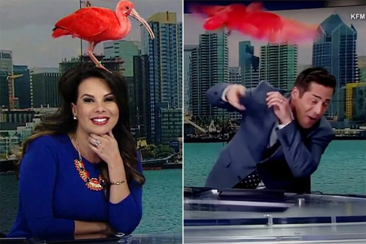 A espécie de ave vista nesta imagem é o íbis escarlate, que habita principalmente o Caribe e as regiões tropicais da América do Sul. Já estava no estúdio como convidada para um programa especial sobre a expansão do Zoológico de San Diego quando este incidente aconteceu.