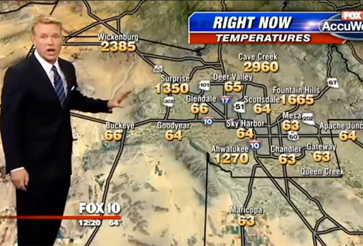 Cory McCloskey é um meteorologista da Fox 10 News de Phoenix, Arizona. Como podemos observar nesta imagem, o seu mapa meteorológico apresentou uma falha técnica neste dia específico. No entanto, ao assistir ao vídeo no YouTube, percebe-se que ele lidou com a situação com maestria e não permitiu que o pequeno contratempo o confundisse.