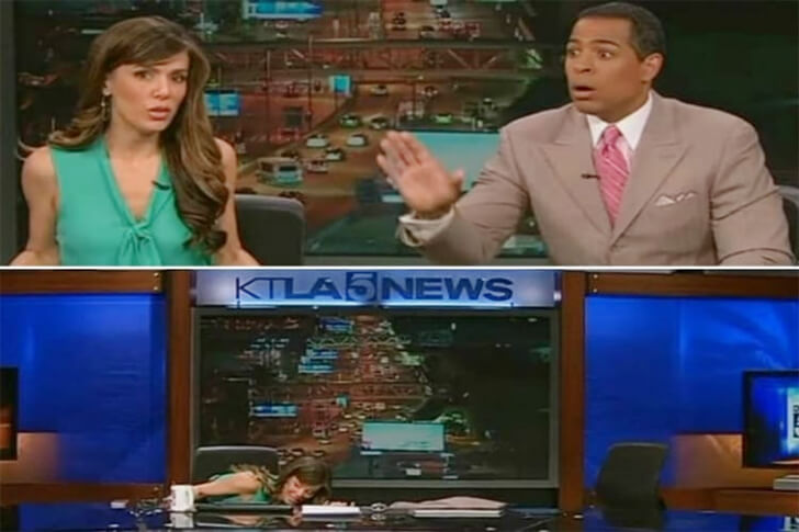 Âncoras de notícias do KTLA 5 ficaram aflitas quando as coisas começaram a tremer. O apresentador masculino foi rápido em reagir e anunciou que estavam enfrentando um terremoto, agachando-se sob a mesa, seguido pela sua co-apresentadora momentaneamente. Embora essa tenha sido a melhor ação a ser tomada nesse caso, a cena parecia um tanto desconfortável na televisão ao vivo.