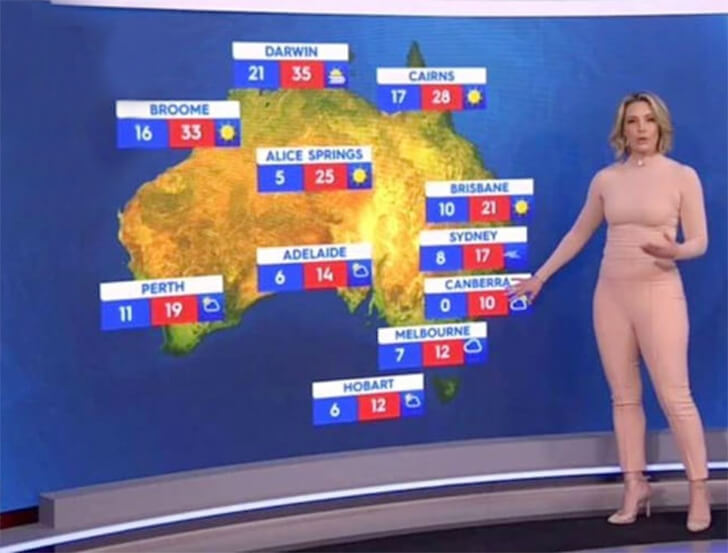 Belinda Russell é uma meteorologista australiana que trabalha em diversos programas, incluindo “Nine News Sydney”, “Weekend Today” e “Today Extra”. Esse pequeno contratempo ocorreu quando ela apresentava a previsão do tempo no último programa, em 2020. Considerado um raro equívoco no guarda-roupa pelo Daily Mail, Russell apareceu no set vestindo este traje de cor de pele, que a fazia parecer estar desprovida de vestimenta.