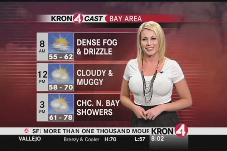 Isso aconteceu em 2010 quando a meteorologista Jacqueline Bennett apresentou ao vivo na KRON 4 em San Francisco. Embora ela já soubesse do clima frio e das tempestades lá fora, estava um pouco despreparada para o frio dentro do estúdio de TV. Claro, nem sempre podemos estar preparados para tudo e ela achou que essa blusa branca seria ótima para o dia.