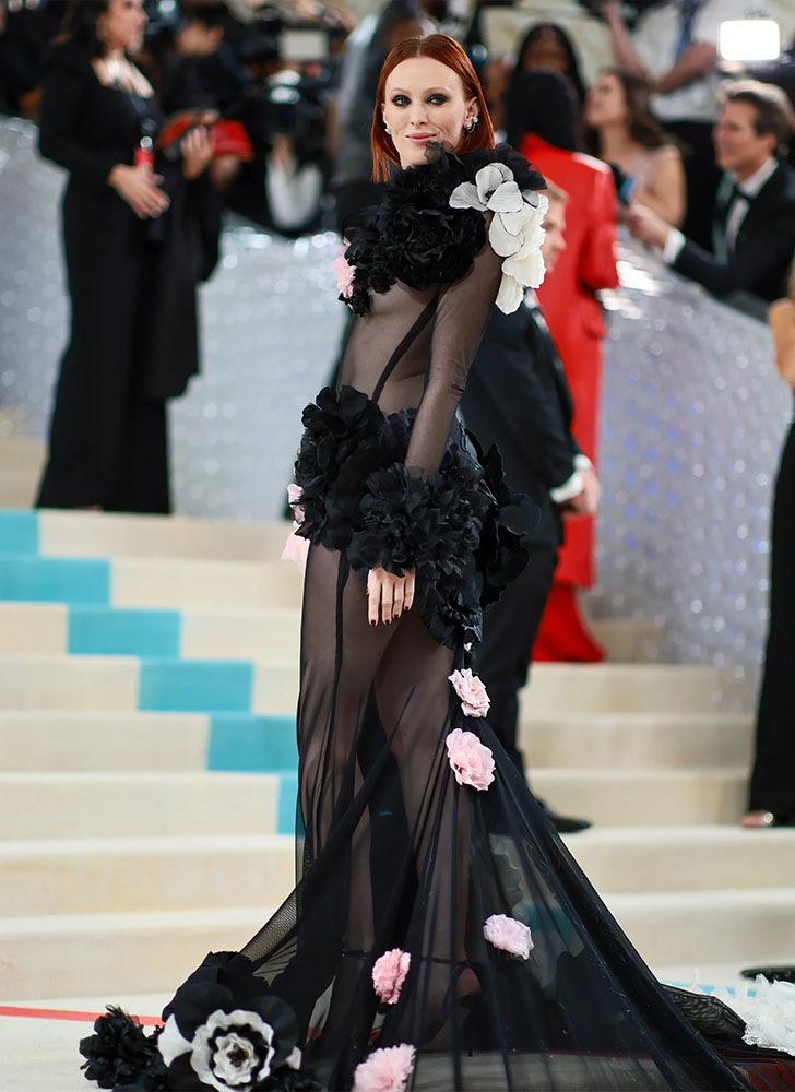 Karen Elson se presentó a la Gala del Museo Metropolitano con un lujoso vestido negro de organza negro con transparencias que llevaba unas flores rosas sobrepuestas haciendo contraste. El diseñador elegido fue Christian Siriano, el ganador de “Project Runway” que está en la lista de las 100 personas más influyentes según Time.