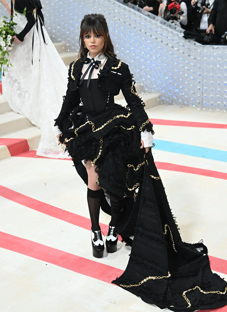 Jenna Ortega realmente hizo una entrada impresionante en su primera Met Gala. Usó una chaqueta negra sobre su vestido negro que tenía una voluminosa cola de volados, cadenas y perlas, creación de Chanel. Calzó unos Oxfords negros y blancos con plataforma de los mismos colores que el vestido. Este fue un toque sofisticado.