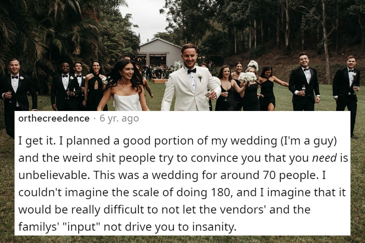 User u/orthecreedence added a new layer to our pastel wedding tale by jumping into the fray. He shared his wedding planning experience, where he was bombarded with suggestions from vendors for a 70-person wedding. Everyone seemed to have an opinion on what was ‘absolutely necessary’ for his big day. This could explain the bride’s decision to lean on her guests to cover costs.