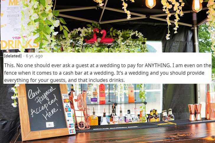 Diving back into the wedding whirlpool, one Reddit user began stirring the waters with their strong stance against guests paying for anything at weddings—especially cash bars. A cash bar is like a regular bar, but instead of free-flowing champagne on the house, guests pay for their own drinks as if they were at a standard pub.