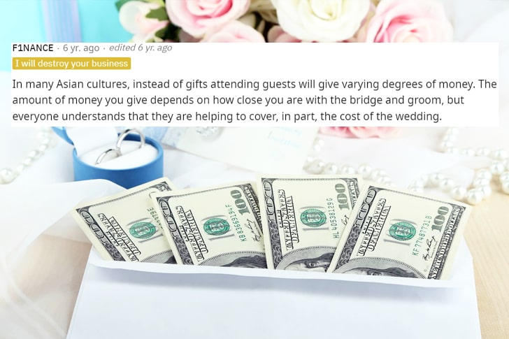 Shifting gears to global wedding customs, a user pointed out something interesting about Asian weddings. In many Asian cultures, it’s common for guests to gift money instead of traditional presents. And it’s widely understood that this cash helps cover the wedding costs.